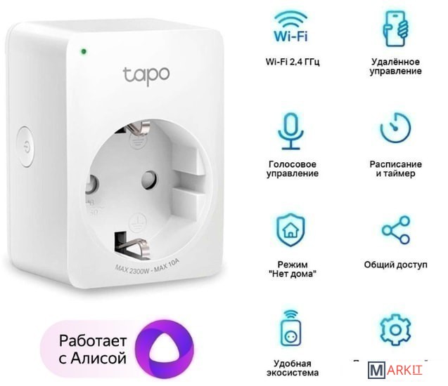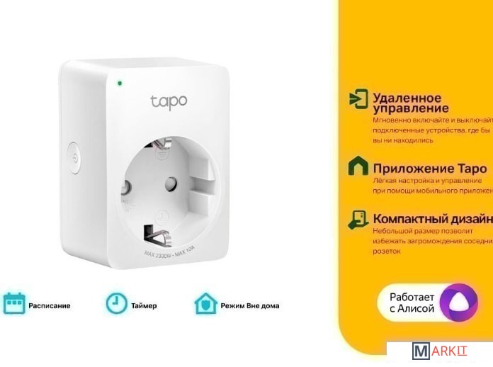 • Удалённое управление — мгновенно включайте и выключайте подключенные устройства через приложение Tapo, где бы вы ни находились• Расписание — создайте расписание для автоматизации работы устройств• Таймер — создавайте списки таймеров обратного отсчёта для подключенных устройств• Голосовое управление — управляйте умной розеткой голосовыми командами при помощи Amazon Alexa или Google Assistant• Режим «Нет дома» — автоматически включает или выключает устройства в определённое время, создавая видимость, что дома кто-то находится• Компактный дизайн — небольшой размер позволит избежать загромождения соседних розеток• Простая настройка и использование — не требуется отдельный центр управления; лёгкая настройка и управление при помощи мобильного приложенияМощность нагрузки – 2300 Вт